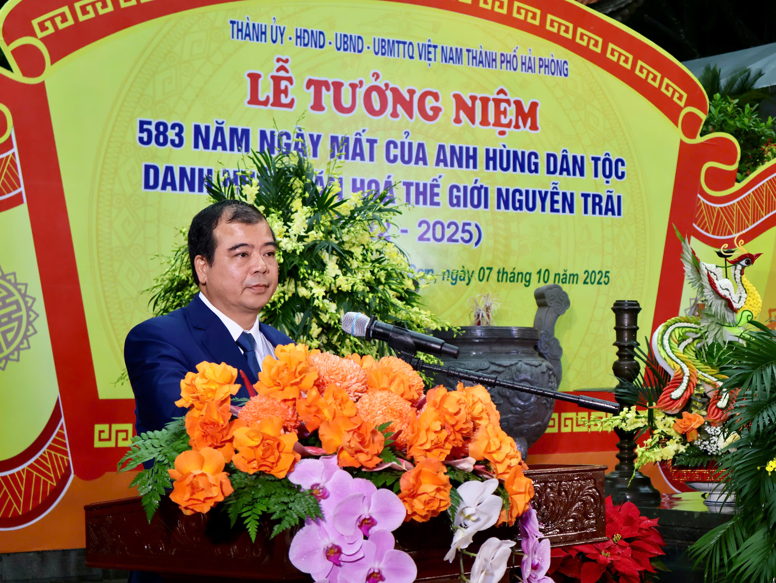 Phó Chủ tịch UBND thành phố Nguyễn Minh Hùng đọc diễn văn tưởng niệm.Phát biểu tại Lễ tưởng niệm, đồng chí Nguyễn Minh Hùng, Phó Chủ tịch UBND thành phố Hải Phòng, Phó Trưởng Ban Thường trực Ban Tổ chức Lễ hội Côn Sơn – Kiếp Bạc năm 2025 nhấn mạnh: Lễ tưởng niệm là hoạt động văn hóa có ý nghĩa đặc biệt, thể hiện sự tri ân sâu sắc của thành phố Hải Phòng và cả nước đối với công lao to lớn của Anh hùng dân tộc Nguyễn Trãi – người văn võ song toàn, nhà chính trị, ngoại giao, tư tưởng và văn hóa kiệt xuất của dân tộc Việt Nam.